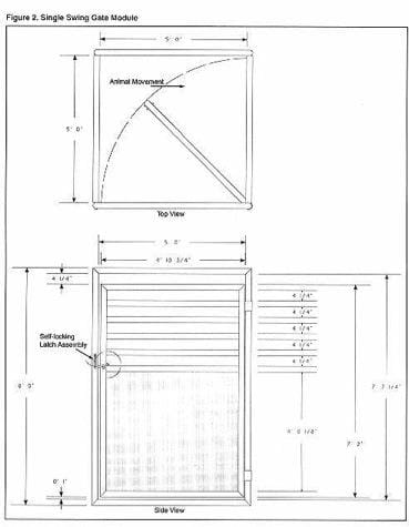 The direction of gate swing and the number swinging gates shown is variable and dependent upon the handling characteristics required by the individual elk producer. Producers must design accordingly to meet their requirements and accommodate any restrictions at the site.