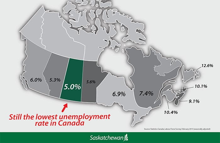 Saskatchewan recorded the lowest unemployment rate in Canada for the month of February 2015, according to new data released by Statistics Canada today. The unemployment rate was 5.0 per cent, compared to a national rate of 6.8 per cent (seasonally adjusted).“We are in the fortunate position of having an economy that is diversified with the strength of potash and agriculture bridging the gap of low oil prices,” Immigration, Jobs, Skills and Training Minister Jeremy Harrison said. “Encouraging news from RBC yesterday shows Saskatchewan’s economy will have an annual growth rate of more than 2.0 per cent in 2015 and 2016, and jobs will likely follow that trend.”