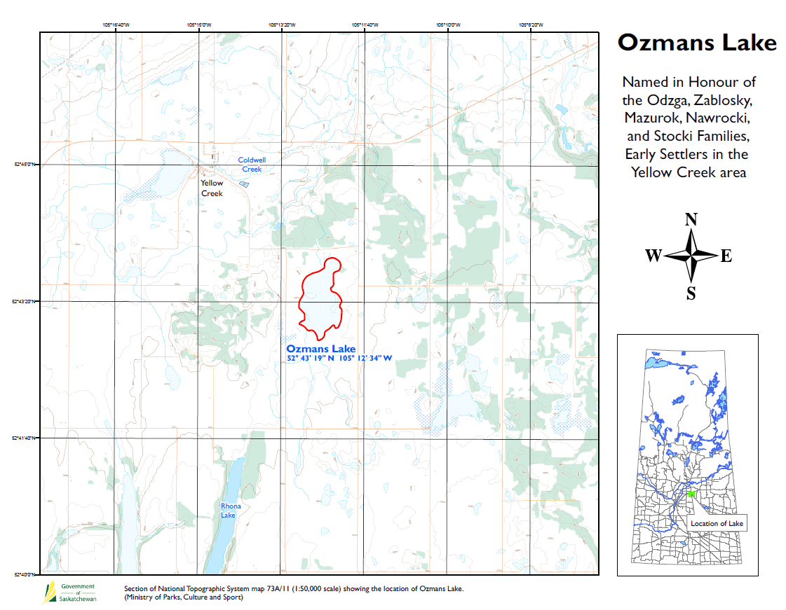 Bearing the combined names of the Odzga, Zablosky, Masurok, Nawrocki and Stocki families, Ozmans Lake can be found approximately 40 kilometres southwest of Melfort, near the former village of Yellow Creek. Residents who live near the area recount that these settlers faced many hardships in the beginning, but with hard work and determination they thrived in Saskatchewan.