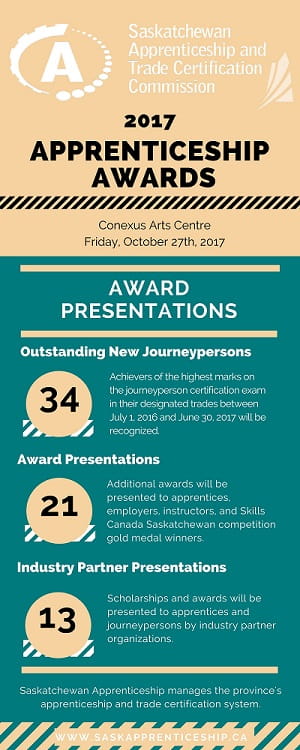 The awards will recognize the 34 journeypersons who achieved the highest marks on the journeyperson certification exam in their designated trades between July 1, 2016, and June 30, 2017. Additional awards will be presented to apprentices, employers, instructors, and Skills Canada Saskatchewan competition gold medal winners.