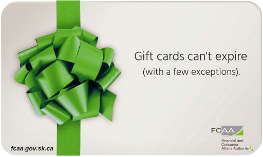 - Gift cards can’t expire - Gift cards bought and sold in Saskatchewan are not allowed to have an expiry date (with a few exceptions). An expiry date is only allowed for gift cards that are issued for charitable purposes or where the consumer provides nothing of value for the card (e.g. as part of an advertising promotion).
