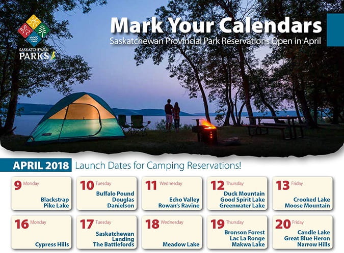 SaskParks has been testing and fine-tuning the online Saskatchewan provincial park registration system, getting it ready for the rush of 2018 bookings. As has been the process for several years now, campsite reservations will be staggered. Starting Monday, April 9, registration launch will take place over 12 days. Go to