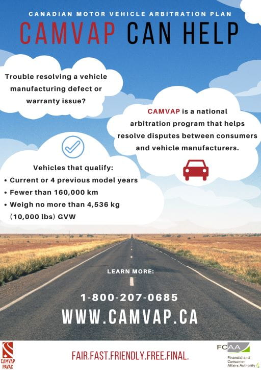 The Financial and Consumer Affairs Authority (FCAA) wants consumers to know about a national arbitration program, the Canadian Motor Vehicle Arbitration Plan (CAMVAP).CAMVAP helps resolve disputes between consumers and vehicle manufacturers about defects in a vehicle’s assembly or materials and warranty issues.