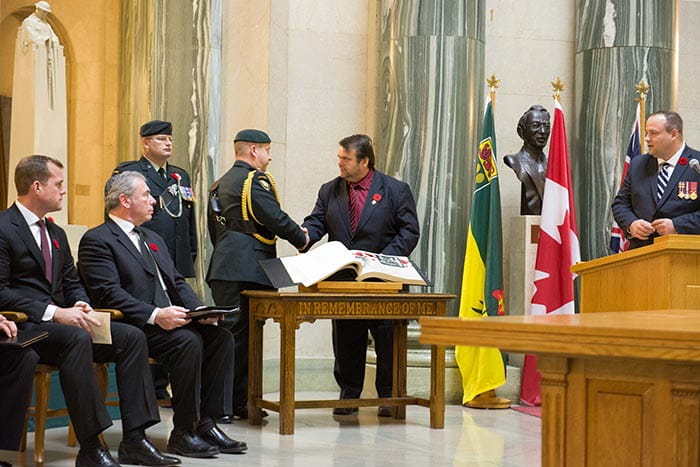 During the service, the Canadian Armed Forces presented the Government of Saskatchewan with the Afghanistan Book of the Fallen to memorialize the 158 Canadians soldiers who gave their lives during the war in Afghanistan.  The Afghanistan Book of the Fallen will be added to the Legislative Library.  Saskatchewan residents are invited to visit the Legislative Library to view the Books of Remembrance, which will be on display during Veterans’ Week.