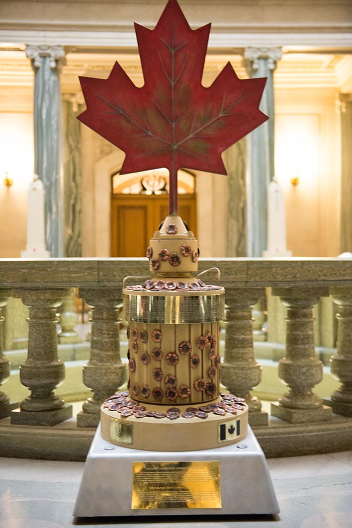 The Afghanistan Poppy Memorial was on display at the service.  The memorial was constructed from a burned out Badger Armoured Fighting Vehicle and made with poppies from the Canadian Armed Forces’ last Remembrance ceremony in Kandahar in 2011.  Each poppy in the memorial represents a Canadian serviceman or servicewoman who died in Afghanistan.  Residents can view the Afghanistan Poppy Memorial at the Legislative Building until November 11.