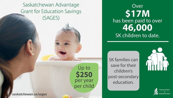 Through SAGES, the Government of Saskatchewan provides a grant of 10 per cent on contributions made since January 1, 2013, into a Registered Education Savings Plan (RESP) to a maximum of $250 per child per year.