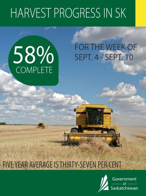 Fifty-eight per cent of the crop is now in the bin, well ahead of the five-year (2013-2017) average of 37 per cent for this time of year.  Twenty-eight per cent of the crop is now swathed or ready to straight-cut.