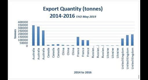World exports of dry broad bean have ranged from 777,413 to 933,100 tonnes in the years from 2014 to 2016. Figure 4 describes the leading dry broad bean exporting countries. Most Canadian exports are to the United States (U.S.) and the Middle East.
