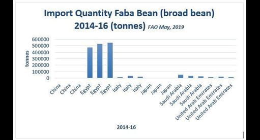 World imports of dry broad bean have ranged from 800,846 to 938,609 tonnes from 2014 - 2016. Figure 5 describes the leading dry broad bean importing countries with Egypt accounting for the majority.