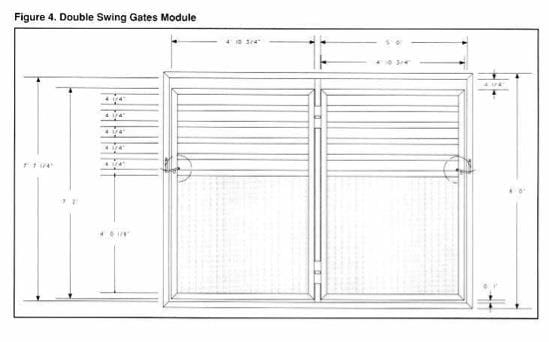 The direction of gate swing and the number swinging gates shown is variable and dependent upon the handling characteristics required by the individual elk producer. Producers must design accordingly to meet their requirements and accommodate any restrictions at the site.