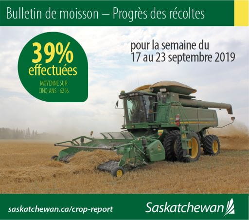 A stretch of warm and relatively dry weather allowed most producers to return to the field and resume harvest operations last week, according to Saskatchewan Agriculture’s Weekly Crop Report. Thirty-nine per cent of the crop is now in the bin, up from 23 per cent last week but remaining well behind the five-year (2014-2018) average of 62 per cent for this time of year.Crops have been slow to mature and dry down due to frequent showers. Much of the crop harvested so far is tough and is being put into grain dryers and aeration bins.