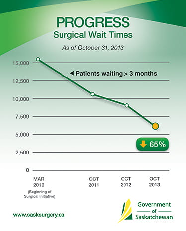 There has been a 65 per cent drop in the number of patients waiting more than three months for surgery since March 2010 when the Saskatchewan Surgical Initiative was launched. On October 31, 2013, there were 5,328 patients still waiting longer than three months, 10,023 fewer than in March 2010.