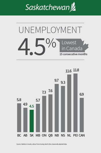 Saskatchewan continues to have the lowest unemployment rate in Canada for the 15th consecutive month. At 4.5 per cent (seasonally adjusted), the Saskatchewan rate was well below the national average of 6.9 per cent.