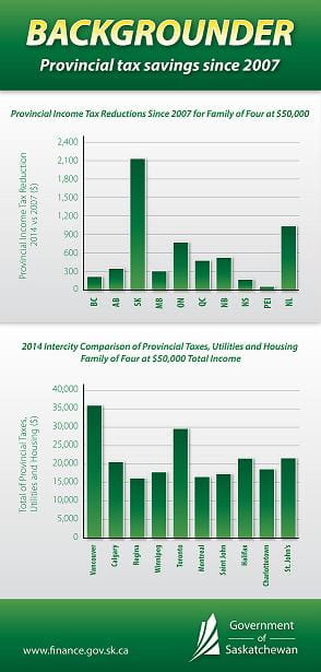 A Saskatchewan family of four with $50,000 in annual income will pay just $166 in provincial income tax in 2014, compared to $2,302 in 2007, representing tax savings of $2,136 annually. In terms of all provincial taxes, that same family will pay $608 in Saskatchewan in 2014, compared to $3,032 in Manitoba, $4,231 in British Columbia and $1,282 in Quebec.