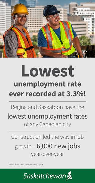 - On a seasonally adjusted basis, Regina's unemployment rate was 3.4 per cent, down from 3.6 per cent in June 2014 and down from 3.6 per cent a year ago. Saskatoon's unemployment rate was 3.6 per cent, down from 3.8 per cent in June 2014 and down from 4.0 per cent a year ago. Saskatoon's unemployment rate was the second lowest, and Regina's unemployment rate was the lowest, among all Census Metropolitan Areas.