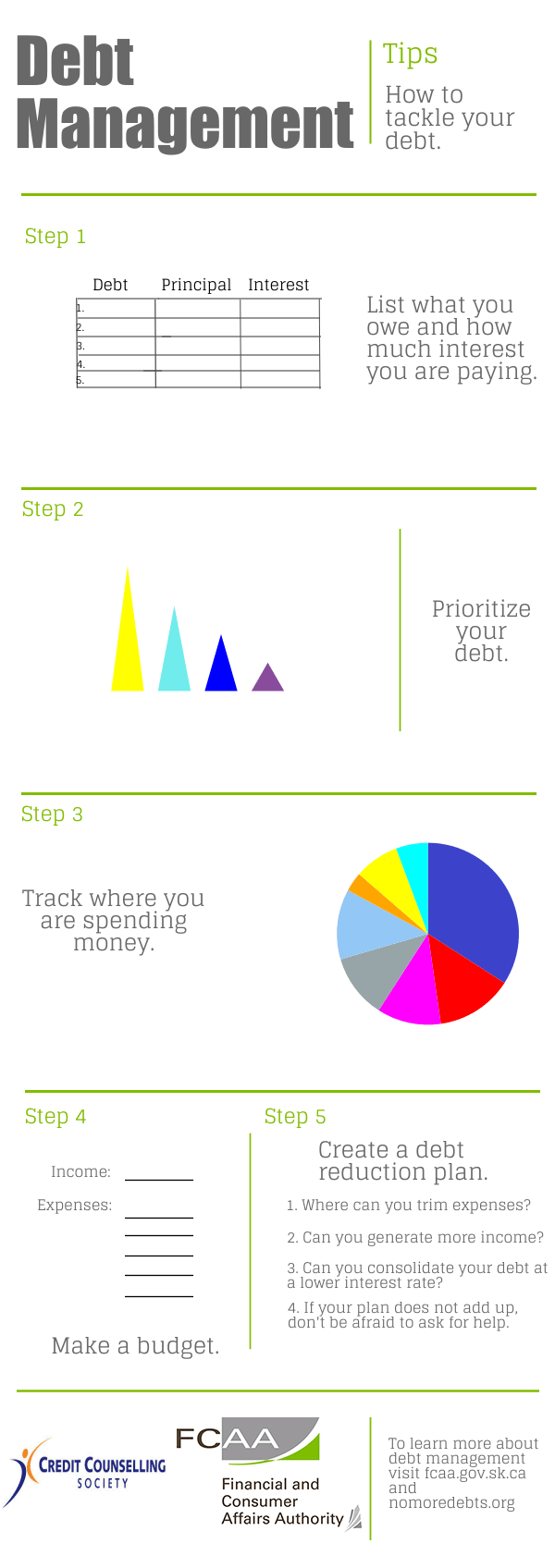 Financial and Consumer Affairs Authority of Saskatchewan (FCAA) in partnership with Credit Counselling Society has created a debt management info graphic to help Saskatchewan people tackle their debt.