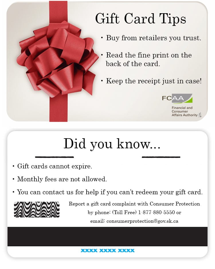 In addition to debt management information, FCAA has also packaged together useful gift card tips, including information about fees, redemption and expiration dates, which will be shared via twitter @SKGov and www.facebook.com/SKGov. For more information about gift cards visit www.fcaa.gov.sk.ca/giftcards.