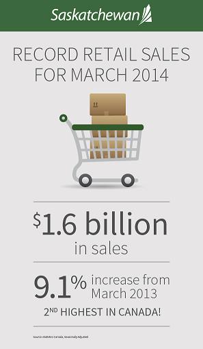 Strong employment numbers and continued growth in the Saskatchewan economy meant consumers had a busy March in the province’s retail sector. In a report released today by Statistics Canada, Saskatchewan’s sales jumped to nearly $1.6 billion for the month. This was a 9.1 per cent increase (seasonally-adjusted) over March 2013, the second highest growth rate among the provinces and a record for the month.