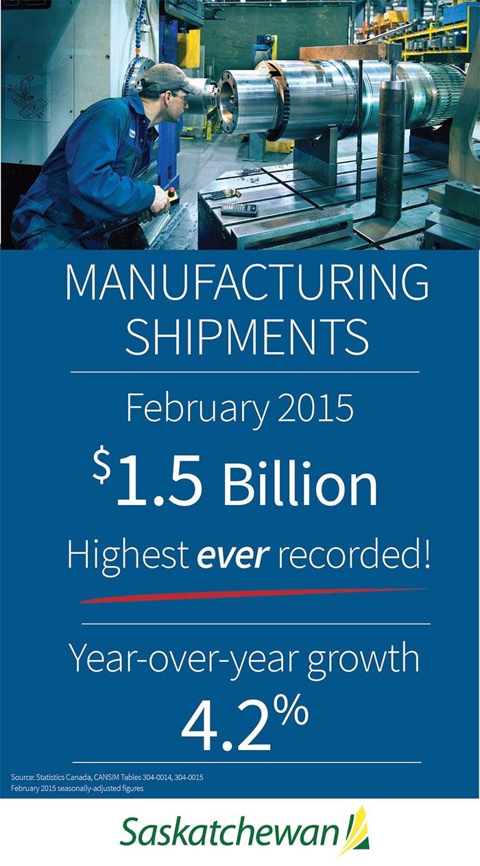 Saskatchewan’s manufacturing shipments in February 2015 were $1.5 billion, the highest ever for the province according to Statistics Canada. This is an increase of 9.3 per cent over January, the second highest percentage increase among the provinces. Nationally, shipments dropped 1.7 per cent.“The manufacturing sector in our province is diverse and successful,” Economy Minister Bill Boyd said. “Saskatchewan manufacturers continue to be leaders in the Canadian industry through their innovation and commitment to the production of quality products.”