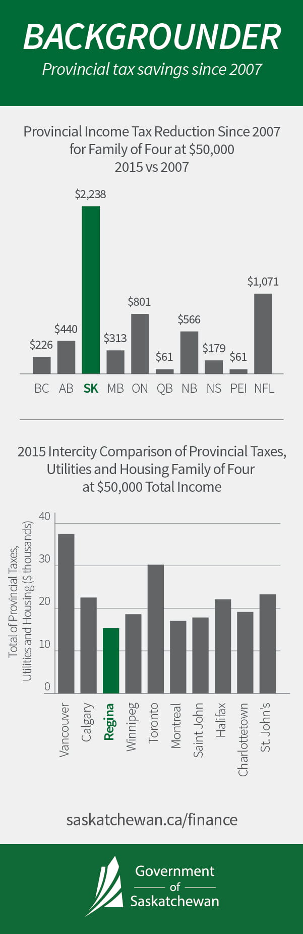 A Saskatchewan family of four with $50,000 in annual income will pay just $64 in provincial income tax for the 2015 tax year (filing in 2016), compared to $2,302 in 2007, representing tax savings of $2,238 annually. In terms of all provincial taxes, that same family will pay $489 in Saskatchewan for the 2015 tax year, compared to $3,032 in Manitoba, $4,293 in British Columbia and $1,103 in Quebec.