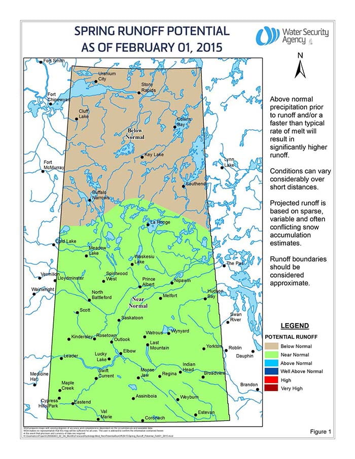 Warm Temperatures in January Lower Snowpack; Near Normal Runoff ExpectedToday, the Water Security Agency (WSA) released the February forecast for spring runoff. A near normal spring runoff is expected across most of the southern half of Saskatchewan with below normal runoff for areas north of Cold Lake, La Ronge, and Creighton.