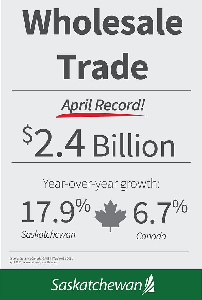 Wholesale trade jumped 17.9 per cent in April 2015 over last April, almost three times the national average of 6.7 per cent according to Statistics Canada. Saskatchewan had the highest percentage increase among the provinces.“Saskatchewan’s economy is making real gains in many areas,” Economy Minister Bill Boyd said. “Diversification has put our province in a highly competitive position relative to the other provinces.”