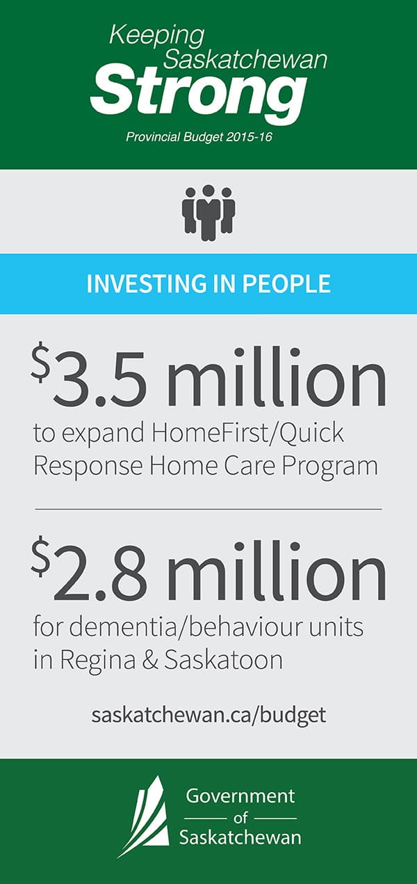 The 2015-16 Ministry of Health Budget provides an additional $10 million investment into new targeted funding to support seniors living in their own homes as well as improving the quality of long-term care. Highlights include: