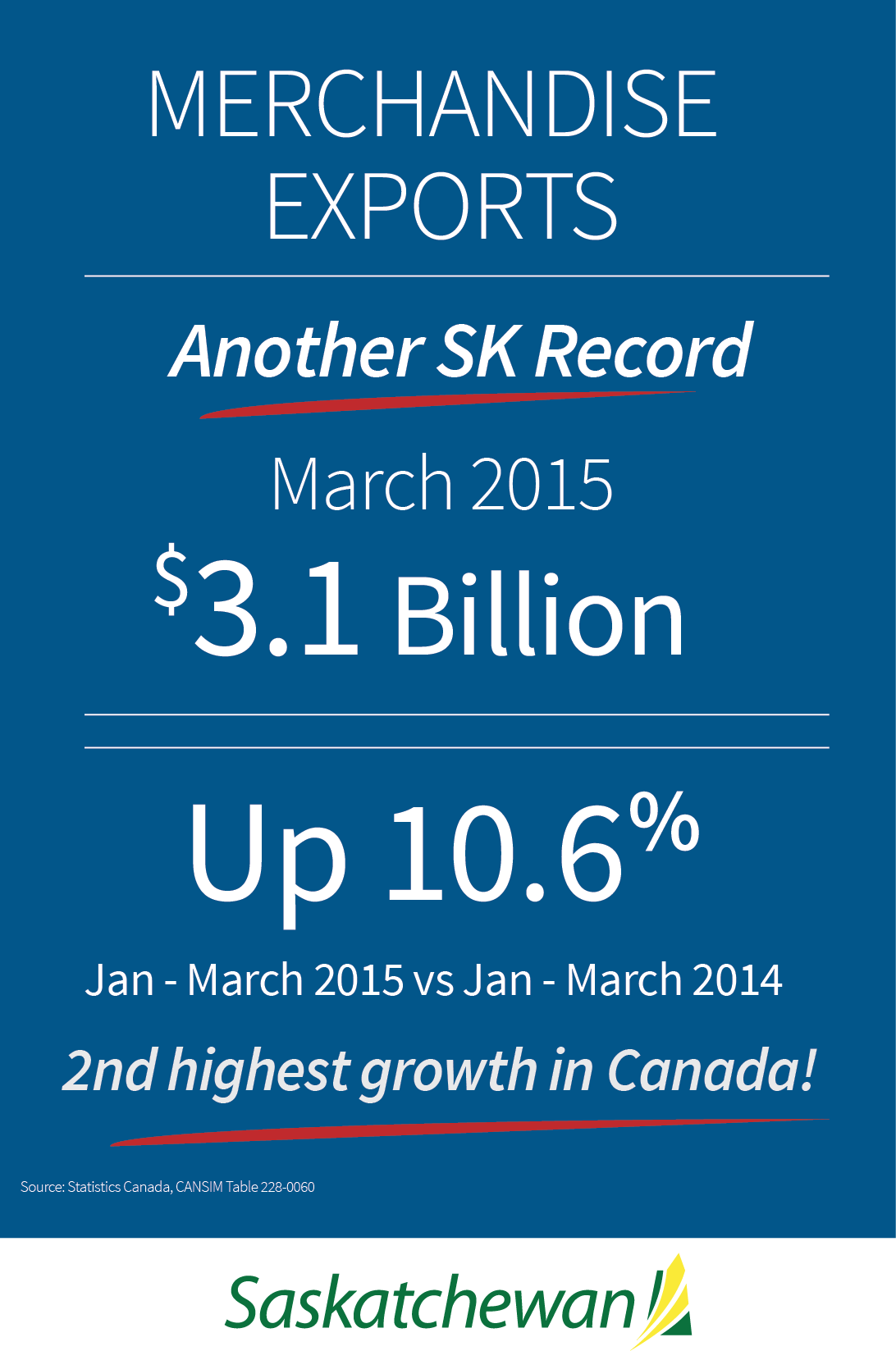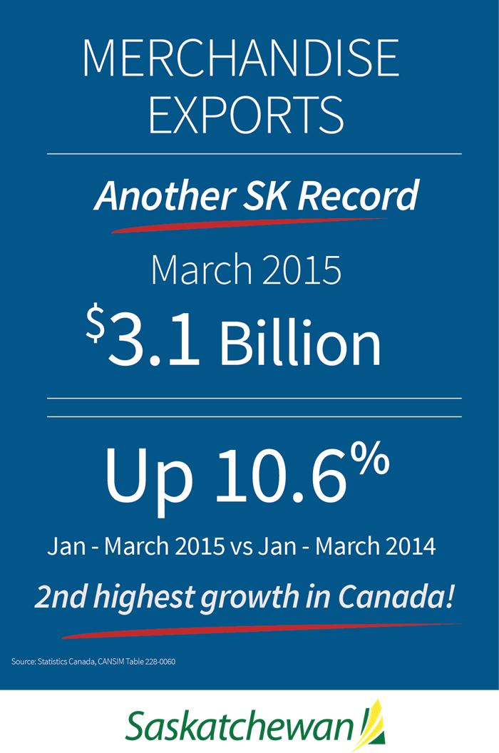 Saskatchewan’s merchandise exports reached $3.1 billion in March (seasonally unadjusted), a 6.4 per cent increase year-over-year, and an all-time high for the month of March according to Statistics Canada.Saskatchewan’s merchandise exports were $8.7 billion for the first three months of 2015, up 10.6 per cent over the same period last year. This was the second largest increase among the provinces.