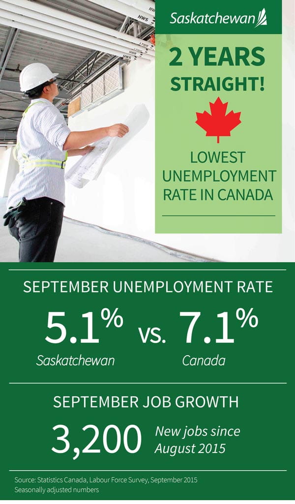 In September 2015, Saskatchewan’s unemployment rate was 5.1 per cent (seasonally adjusted), marking two consecutive years the province has had the lowest unemployment rate among the provinces. The national unemployment rate in September stood at 7.1 per cent.