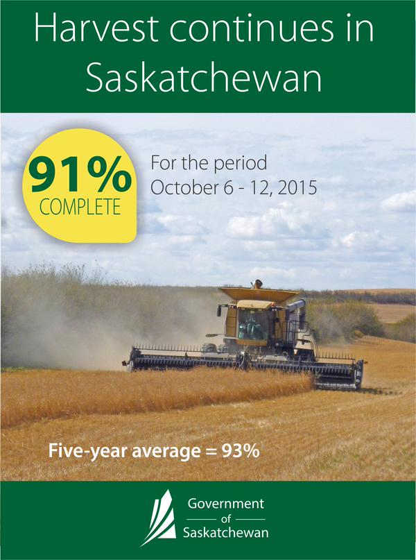 Warm and relatively dry weather earlier in the week allowed many producers to return to the field. Ninety-one per cent of the 2015 crop is now combined, up from 84 per cent last week. The five-year (2010-2014) average for this time of year is 93 per cent combined, according to Saskatchewan Agriculture’s Weekly Crop Report.Regionally, producers in the southwest are furthest advanced, having 96 per cent of the crop combined. Producers in the southeast have 95 per cent combined. Eighty-eight per cent of the crop is combined in the west-central and northwest regions; 87 per cent in the east-central region and 83 per cent in the northeast.