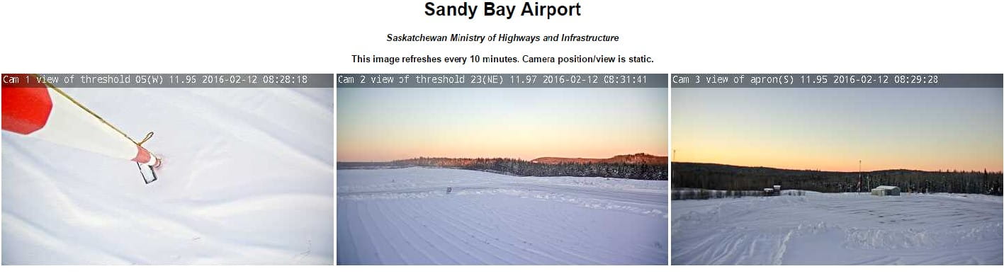 The Ministry of Highways and Infrastructure has installed three web-based cameras at Sandy Bay Airport in northeastern Saskatchewan. Similar to highway cameras located across the province, visual information taken by the Sandy Bay Airport webcams offer views of the approaches to the runway, which allows pilots the opportunity to assess for potential weather-related hazards.
