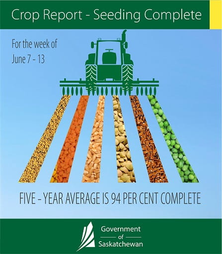 Seeding in Saskatchewan is expected to be completed this week, according to Saskatchewan Agriculture’s Weekly Crop Report. While there are few fields of oats and flax as well as some greenfeed and silage being seeded at this time, 99.5 per cent of the crop is in the ground. The five year (2011-2015) average for this time of year is 94 per cent seeded.