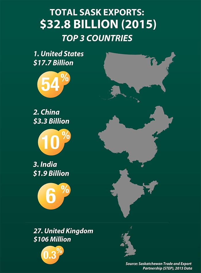 “While yesterday’s vote is obviously significant, we do not expect it to have that much of an effect on Saskatchewan exports. We are well-positioned to stay strong through the near-term Brexit volatility.“Saskatchewan’s top export markets are the US and Asian-Pacific markets like China, India, Japan, Indonesia and Bangladesh. Those six countries alone accounted for over 77 per cent of Saskatchewan’s $32.6 billion in exports in 2015. The European Union, while important, accounted for slightly less than four per cent of Saskatchewan’s exports in 2015 and the UK specifically made up just 0.3 per cent.