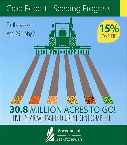 Thanks to warm and dry weather, Saskatchewan producers have 15 per cent of the 2016 crop seeded, according to Saskatchewan Agriculture’s weekly Crop Report. The five-year (2011-2015) seeding average for this time of year is four per cent. Many producers in the south have been seeding for several weeks, while those in the rest of the province are just getting into the field.