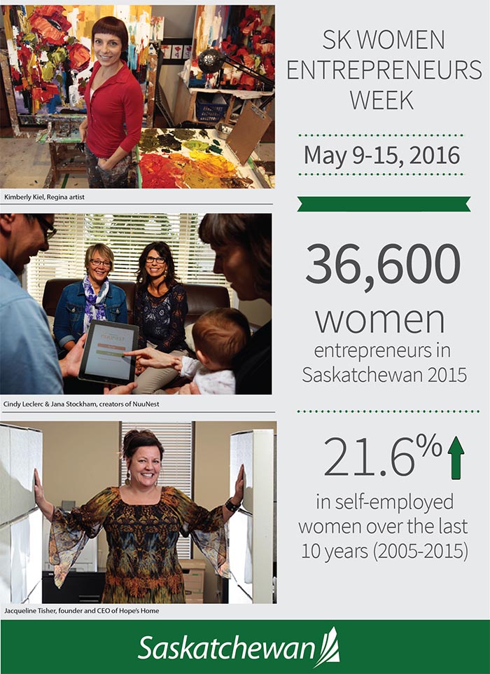 The Government of Saskatchewan is pleased to proclaim May 9 to 15, Women Entrepreneurs Week in Saskatchewan. The week provides an opportunity to recognize and celebrate the successes of women entrepreneurs in Saskatchewan and their contributions to the province’s economy.The number of self-employed women in Saskatchewan grew by 21.6 per cent from 30,100 in 2005 to 36,600 in 2015. The province’s women entrepreneurs contribute to various business areas, including professional services, wholesale and retail trade and the hospitality industries.