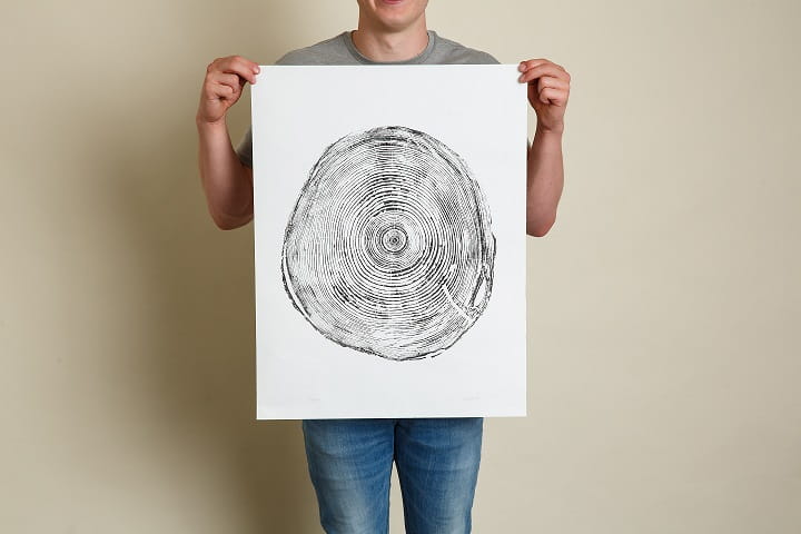 Each item is hand-printed directly from slices of burned trees, taken from Lac La Ronge Provincial Park. This unique and manual process makes each piece slightly different from the next.