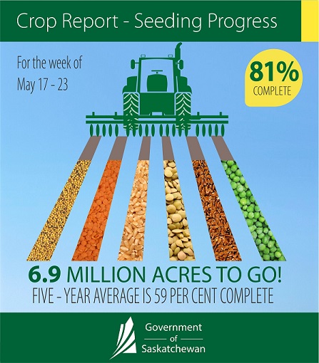 Great strides were made this past week, as 81 per cent of the crop is now seeded, according to Saskatchewan Agriculture’s weekly Crop Report. Warm and dry weather has allowed producers to remain well ahead of the five year (2011-2015) seeding average of 59 per cent.