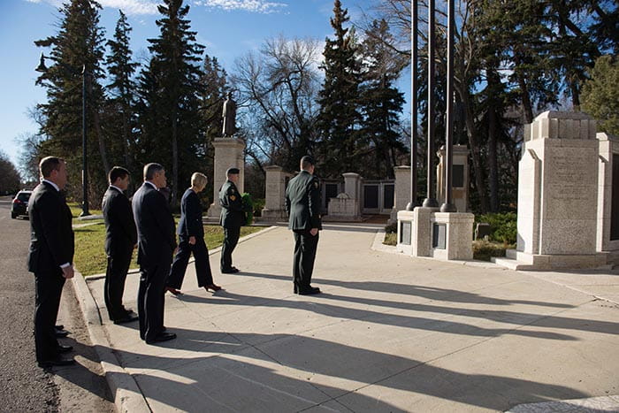 Following the service, the Provincial Secretary laid a wreath at the Saskatchewan War Memorial, which is located on the Legislative grounds to the west of the Legislative Building. The memorial lists the names of Saskatchewan’s fallen over the generations.