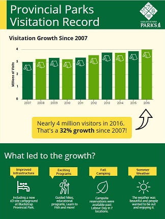 Visitation has been strong to provincial parks for several years, and can be attributed to a focus on providing visitors with engaging programs, desirable facilities and infrastructure, and a commitment to customer service.
