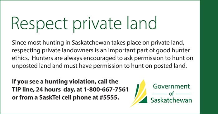 Since most hunting in Saskatchewan takes place on private land, respecting private landowners is an important part of good hunter ethics.