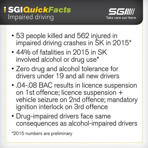 Preliminary numbers for 2015 show 53 people were killed and 562 others were injured in Saskatchewan in crashes related to impaired driving. In 2015, 44% of traffic fatalities in the province involved alcohol or drug use.
