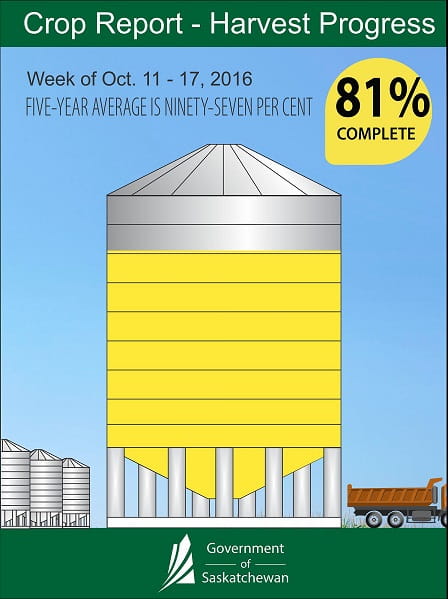 Wet and cool weather continues to delay harvest. Frequent rain and snow, along with cool temperatures have stalled harvest for almost three weeks. Eighty-one per cent of the 2016 crop is combined and 15 per cent is swathed or ready to straight-cut, according to Saskatchewan Agriculture’s Weekly Crop Report. The five year (2011-2015) average for this time of year is 97 per cent combined.