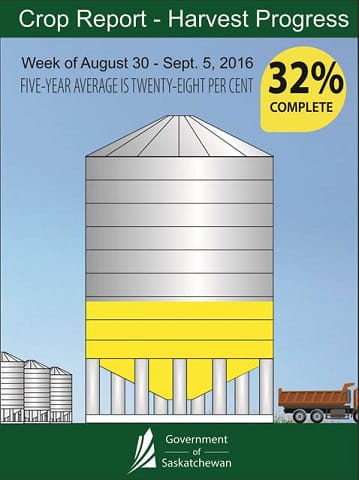 Saskatchewan producers made good progress with harvest, thanks to a week of primarily dry weather. Thirty-two per cent of the crop has been combined and 38 per cent is swathed or ready to straight-cut, according to Saskatchewan Agriculture’s Weekly Crop Report. This is ahead of the five year (2011-2015) average of 28 per cent combined for this time of year.