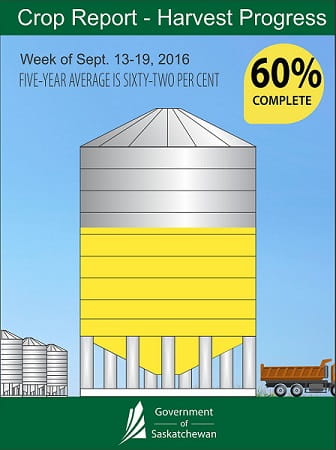 A dry and windy week has allowed producers to make significant harvest progress. Sixty per cent of the 2016 crop has been combined and 28 per cent is swathed or ready to straight-cut, according to Saskatchewan Agriculture’s Weekly Crop Report. The five year (2011-2015) average for this time of year is 62 per cent combined.