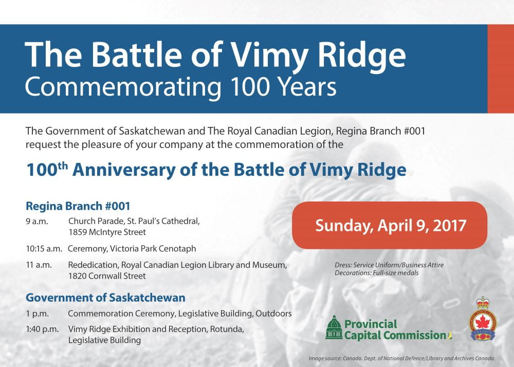 On April 9, The Royal Canadian Legion, Regina Branch #001, will honour Vimy Ridge veterans with a number of events held that morning in downtown Regina, including a ceremony at the Victoria Park Cenotaph. That same afternoon the Provincial Capital Commission will host a commemoration ceremony outdoors at the Legislative Building.