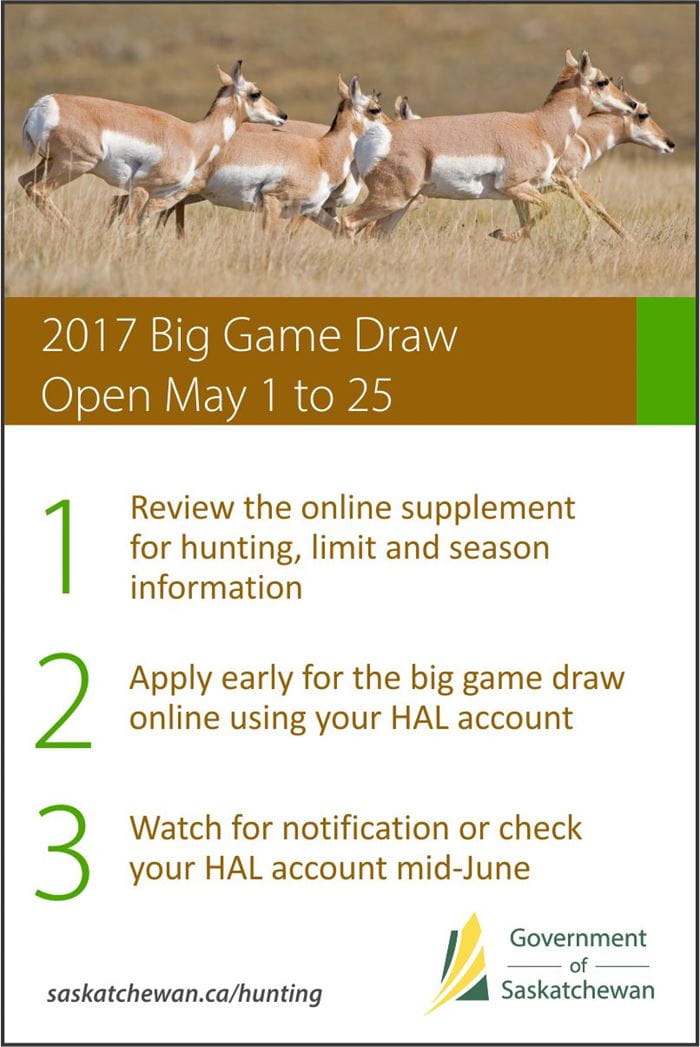 Find more information about the big game draw, visit www.saskatchewan.ca/residents/parks-recreation-heritage-and-arts/hunting-trapping-and-angling/hunting/apply-for-the-big-game-draw.