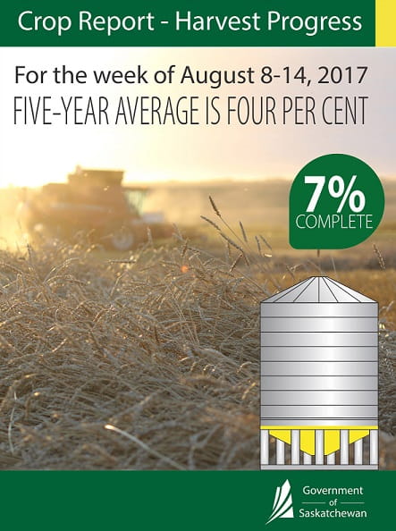 Despite rain delays in some areas, producers in the province now have seven per cent of the crop in the bin and seven per cent swathed or ready to straight-cut. The five-year (2012-2016) average for this time of year is four per cent combined and six per cent swathed or ready to straight-cut, according to Saskatchewan Agriculture’s Weekly Crop Report.