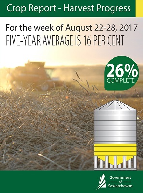 Relatively warm and dry weather has allowed producers to continue making good time with harvest, according to Saskatchewan Agriculture’s Weekly Crop Report. Twenty-six per cent of the crop is now in the bin, well ahead of the five year (2012-2016) average for this time of year of 16 per cent combined. Twenty-four per cent of the crop is swathed or ready to straight-cut.