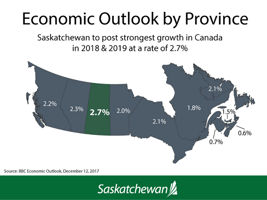 Saskatchewan will lead Canada in economic growth in 2018 and 2019, according to the most recent RBC Economics Provincial Outlook. The report projects growth of 2.7 per cent for both years, compared to 1.9 per cent in 2018 and 1.6 per cent in 2019 for Canada.
