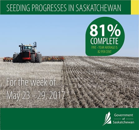 Saskatchewan producers now have 81 per cent of the 2017 crop in the ground, right in line with the five-year (2012-2016) seeding average for this time of year of 82 per cent. Wet field conditions and frequent rainfall in many northern areas have delayed progress, and producers there will need a couple more weeks of warm and dry weather.